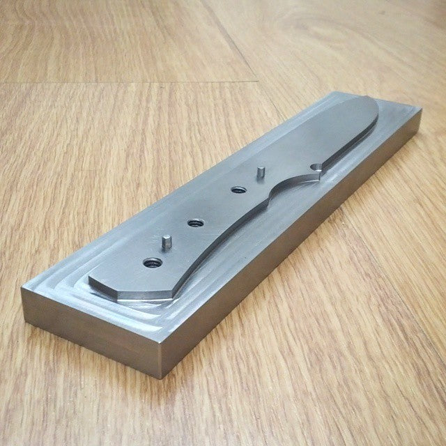 The knife blank is located on the fixture using two dowel pins (one round, one diamond) and then a special clamp bolts through holding it in place!