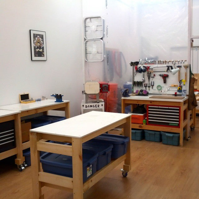 Adding more standing workbenches rather than seated benches almost doubled my storage space, and the place feels a lot more open and usable at the same time! Very pleased with how it came out. This week will see the first real use of the machining center as well! Exciting times!